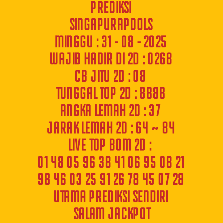 Prediksi Singapore Senin, 29-09-2025 Merupakan Prediksi Otomatis yang menggabungkan Metode Kalender Togel Dengan LN Generator yang akurasi prediksinya sudah kita ketahui bersama. Jadi harap Maklum Jika kadang meleset Prediksi Singapore kita. Jadikan ini sebagai perbandingan saja dan tetap Utamakan karya sendiri